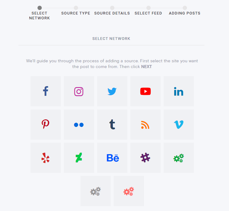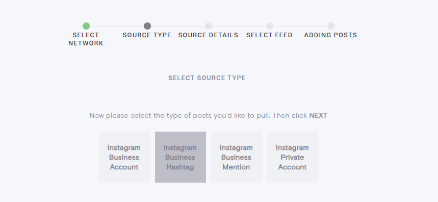 Next, select the network and source type. For example, if you're using Instagram, you can pull content from your Business account, a hashtag, or specific posts.