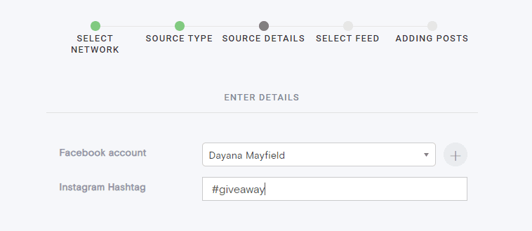 If you choose a hashtag source, you’ll need an Instagram Business account. Enter the needed details, choose the account, and add the hashtag or handle you want to gather content from.
