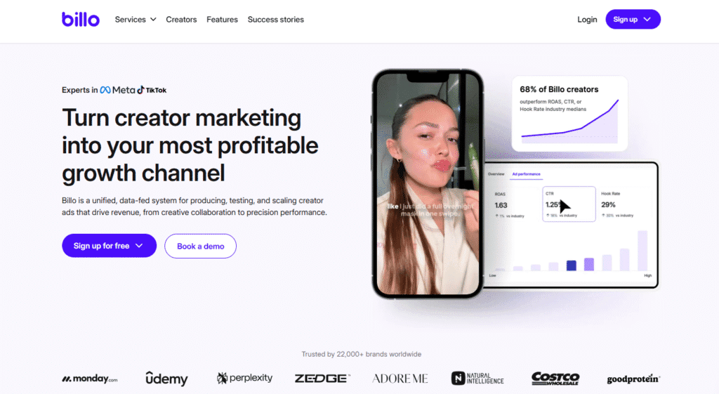 With TikTok and Meta gurus in its network, Billo focuses specifically on creator-driven ad production and performance rather than broad influencer management. Unlike Grin, which focuses on UGC and long-term influencer partnerships, Billo is all about data-led campaigns. It’s ideal for brands that want high-performing video ads without the complexity of full influencer management.