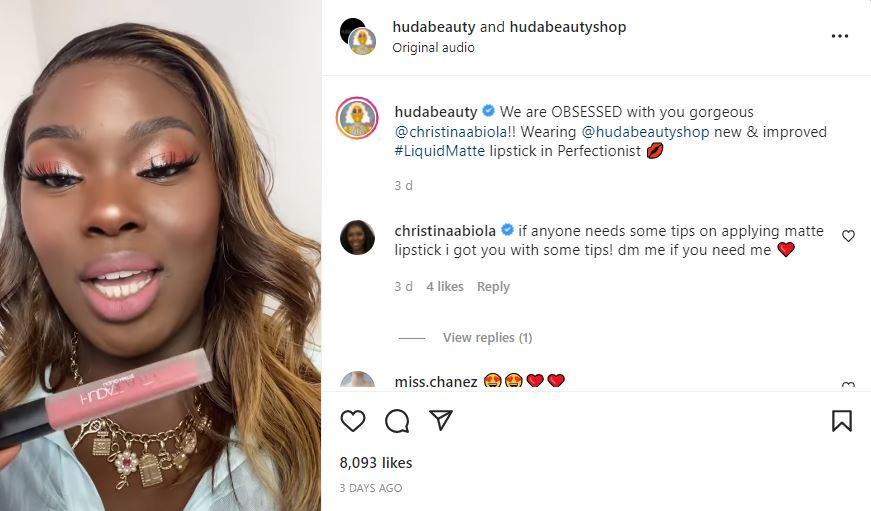 Here’s how makeup brand HUDAbeauty leverages UGC to promote their new lipstick—Perfectionist—for women with a darker skin tone.