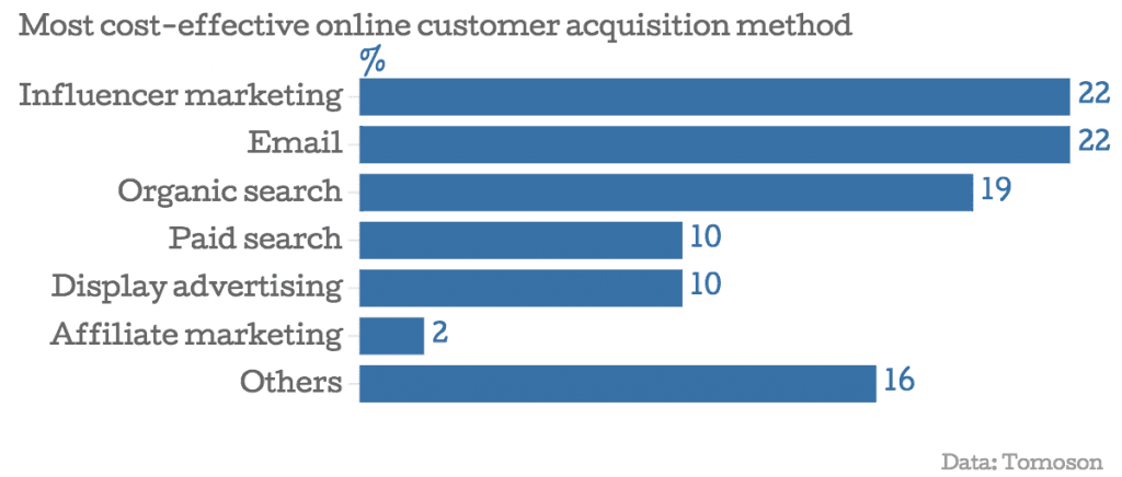 Influencer marketing can also provide a great marketing ROI, providing that you partner with the right influencers. 22% of marketers reported influencer marketing as the most cost-effective customer acquisition method.
