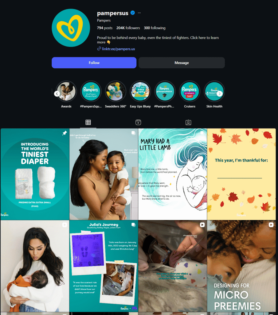 Pampers also uses a mix of brand-created content and UGC. A cursory look at their Instagram page shows that posts showing real people using their products get far more comments and engagement than other posts. This once again proves the power of UGC ecommerce.