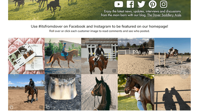 Another common form of aggregating content is pulling together posts from fans and customers. This is an amazing way to show brand authority and build community. Brands can encourage customers to post with a branded hashtag, then they can approve which posts to utilize and showcase in their own feed. This example is from Dover Saddlery, and they encourage customers to use the hashtag #itsfromdover.