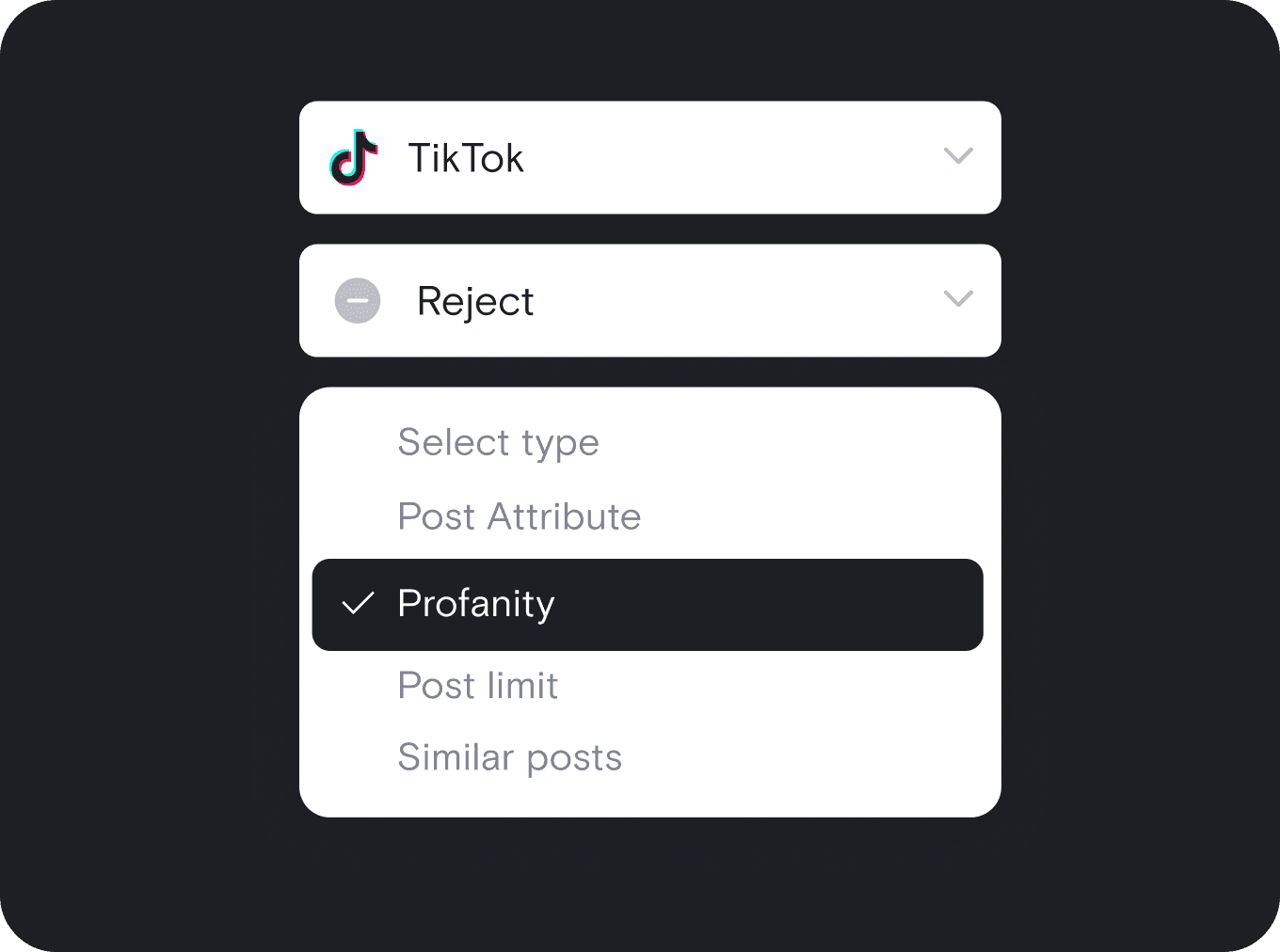Stay in control of your embedded TikTok content. Choose automatic or manual moderation and block posts by keyword. Only the videos you approve will be displayed on your site.