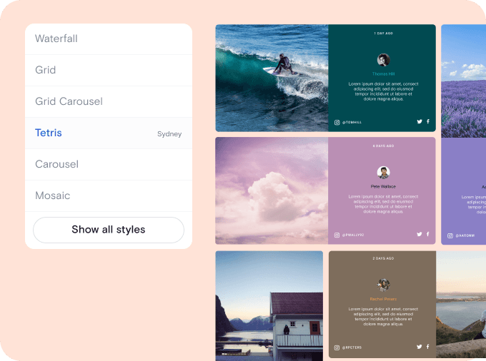 You don’t need to be a pro website designer to create a beautiful social media feed. Just click through our templates to preview how content will look on your site and pick your favorite one.