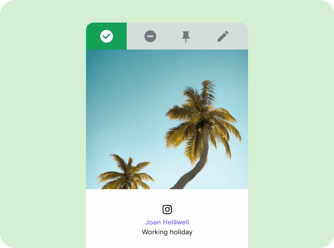 Pull content from accounts, hashtags, mentions & geolocations. Deny posts that don’t meet your criteria.