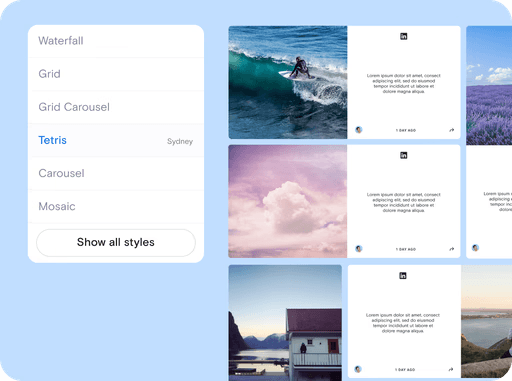Select from 20+ modern templates including Grid, Waterfall, Mosaic, Carousel, Tetris, and Stack. Each layout is beautifully designed and easy to customize to match your site’s look and feel.